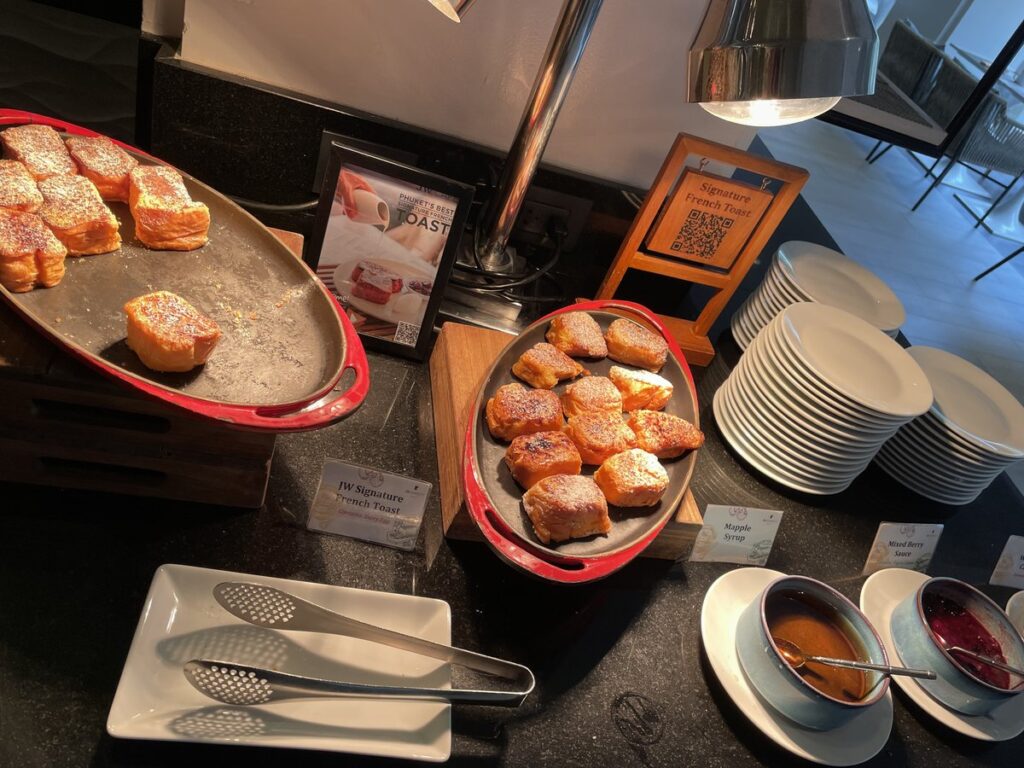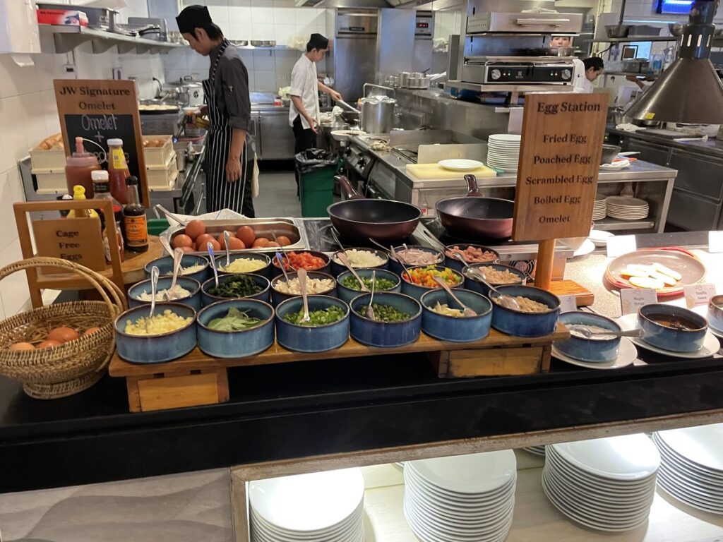 朝食会場は「JW Cafe」と「Cucina」の2か所あり、どちらも内容は同じでした。JW Cafeの方がメイン?のようで、みなさんそちらに行かれていました。内容は同じなのでゆっくりされたい方はCucinaの方がいいかもしれません。