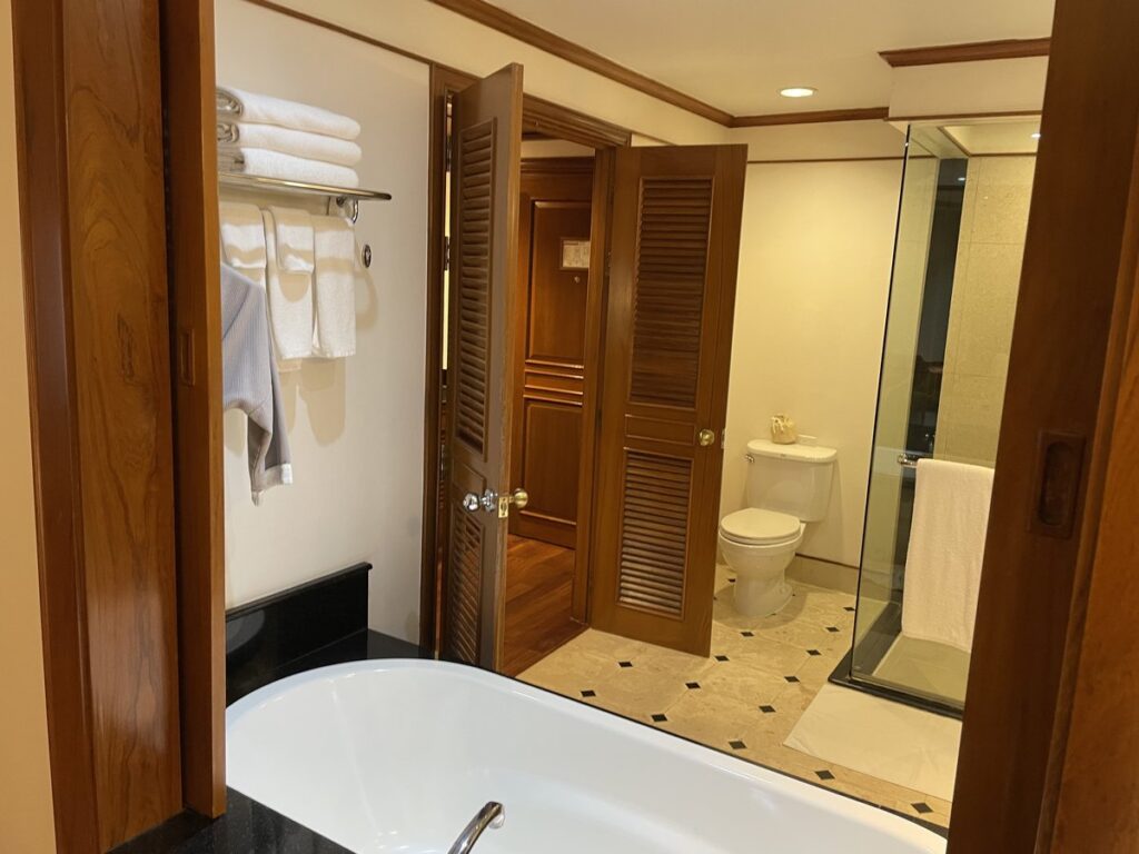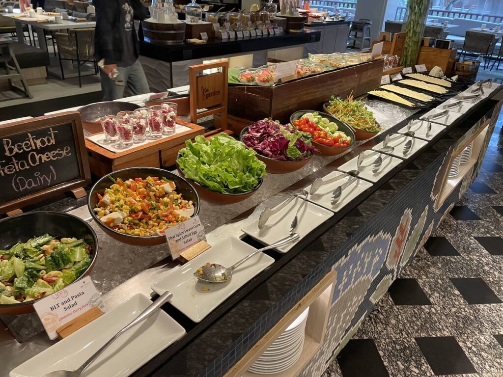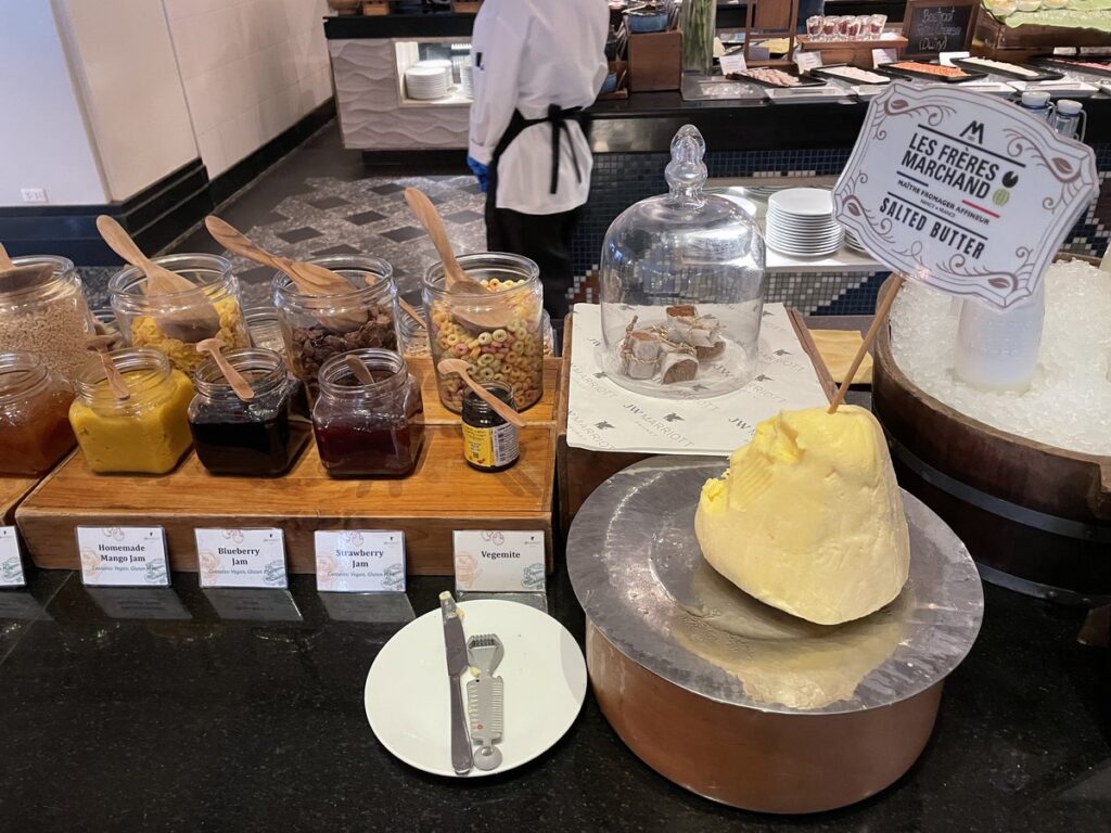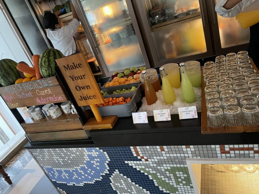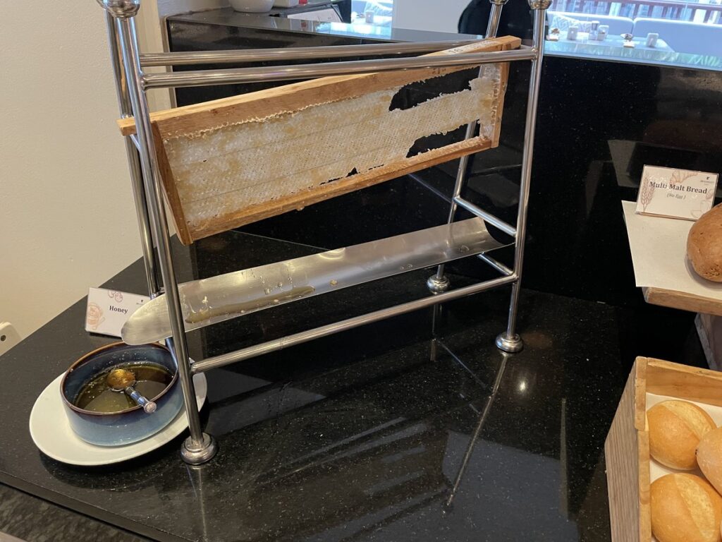 朝食はビュッフェ形式で、洋食・タイ料理・中華料理まで幅広く揃っています。フレンチトーストがシグネチャーのようで、みなさん食べていました。はちの巣からいただくはちみつや自分好みに作ってもらえるフレッシュジュースなど、大満足の内容です。これがプラチナ会員特典で無料となるのは大変ありがたいです。