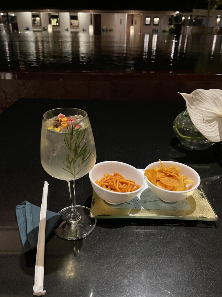 プラチナ特典で、Lobby Barでのクーポン券をいただきました。こちらの中から1杯無料でドリンクをいただけます。おつまみのナンプラー味のスナックが斬新でとても美味しかったです。